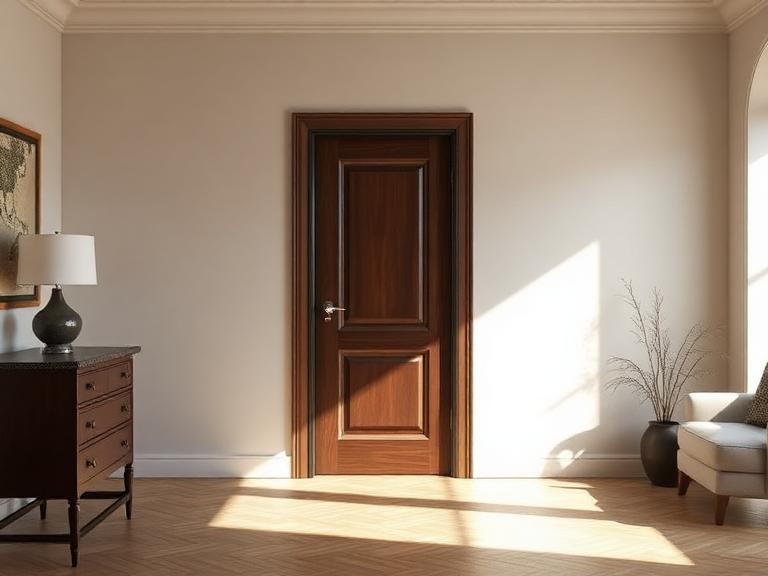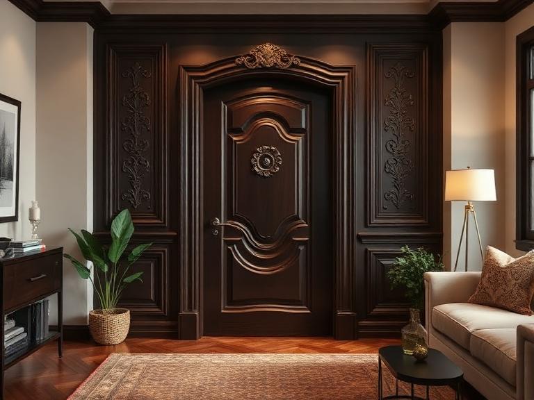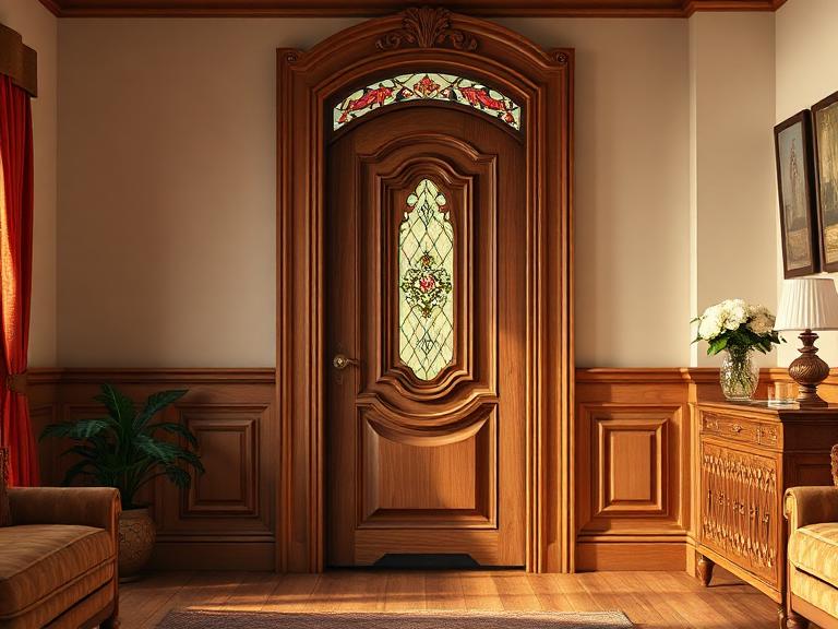 - Классика или неоклассика — выбирайте модели с резьбой или шпонированным массивом в тёплых тонах.