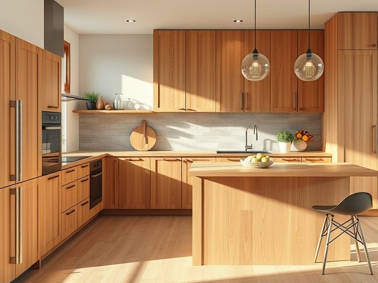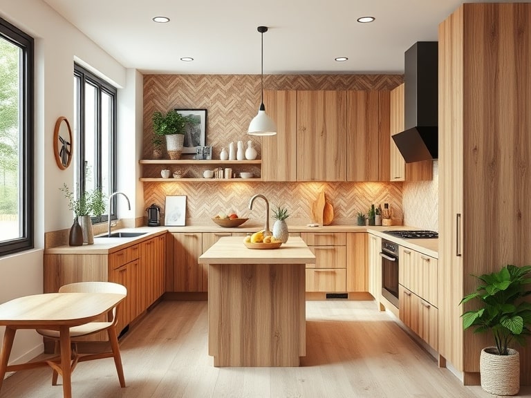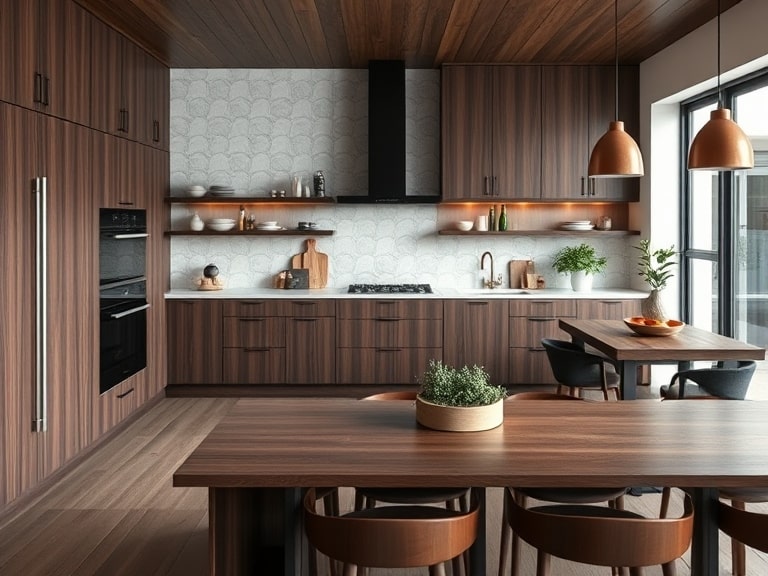 Дерево удачно сочетается с другими материалами, такими как стекло, металл, камень или акрил, что позволяет создавать современные кухни в стилях минимализма, хай-тек или японского дизайна. Это доказывает, что дерево остается актуальным материалом не только для классики, но и модерновых решений.