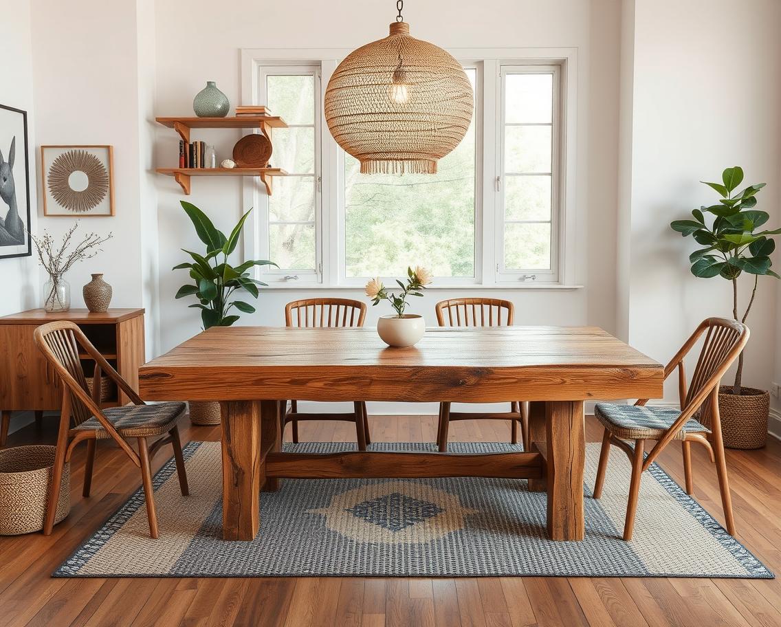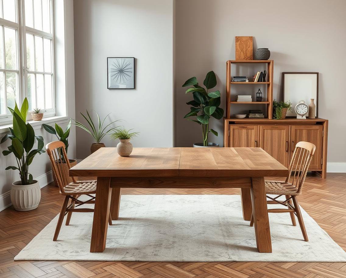 - Современный эклектичный стиль: стол из натурального дерева помогает сочетать разные элементы и стили, создавая гармоничный и сбалансированный интерьер.