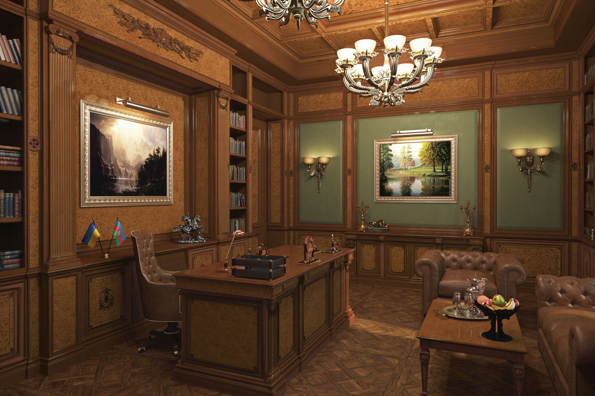 - Классический стиль - классические кабинеты директора выглядят впечатляюще с кожаными диванами и массивной деревянной мебелью, с элементами резьбы, в темных породах дерева, с декором из латуни или бронзы.